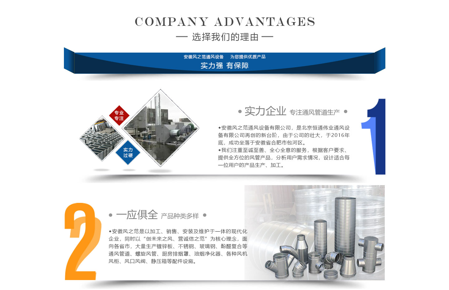 安徽風之范通風設備有限公司,是北京恒通偉業(yè)通風設備有限公司再創(chuàng)的新臺階,多年來,公司員工憑著“誠信敬業(yè)、團結拼搏、勇于開拓、務實進取”的企業(yè)精神,先后承接了多項重點工程項目,使公司健康穩(wěn)步發(fā)展?,F(xiàn)由于公司的壯大,業(yè)務的拓展,又于2016年底,成功坐落于安徽省合肥市包河區(qū)。本公司生產(chǎn)設備精良,技術力量雄厚,質(zhì)保體系完善!讓用戶體驗到,貼心的服務,無憂的售后!風之范是以加工、銷售、安裝及維護于一體的現(xiàn)代化企業(yè),同時以“創(chuàng)未來之風、營誠信之范”為核心理念,面向全國各省市,大量生產(chǎn)鍍鋅板、不銹鋼、玻璃鋼、酚醛復合等通風管道、螺旋風管、廚房排煙罩、油煙凈化器、各種風機風柜、風口風閥、靜壓箱等配件設施。廣泛承接商場、工廠、酒店、寫字樓、地下室等,消防排煙工程、除塵凈化工程、室內(nèi)通風工程、暖通空調(diào)工程、廚房排煙凈化工程。我們力求上進,追求,歡迎各界人士技術指導,經(jīng)濟合作,共創(chuàng)美好明天!